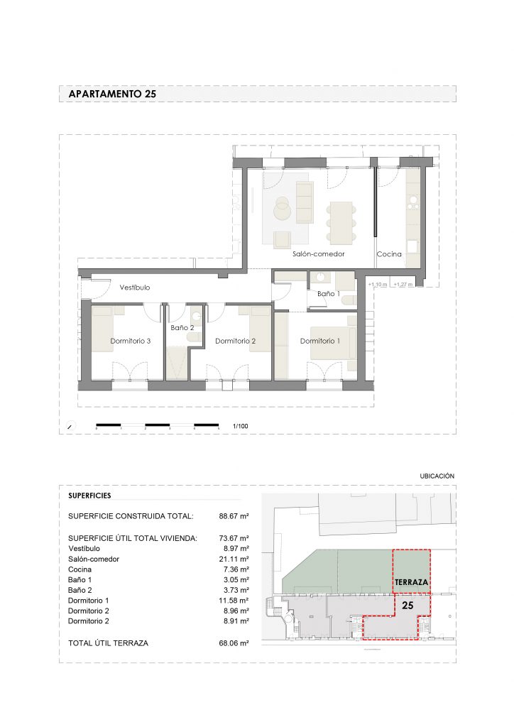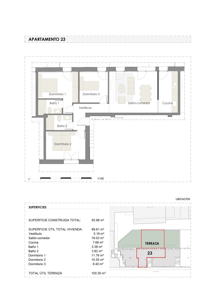 Licencia de obras del Ayuntamiento de Zaragoza de fecha 22 de julio de 2020. Por las características particulares de local, que posee el uso y disfrute del patio de luces del inmueble que puede ser destinado a jardín o terraza, se han planteado tres viviendas orientadas a la venta, dos de tres habilitaciones y una de dos habitaciones, con una espectacular terraza de más de 100 m2 en cada una de ellas. Cumpliendo la normativa urbanística el acceso a las viviendas es por el zaguán comunitario y los forjados de las viviendas están a un metro por encima del nivel de la calle. Las tres viviendas ya están vendidas.