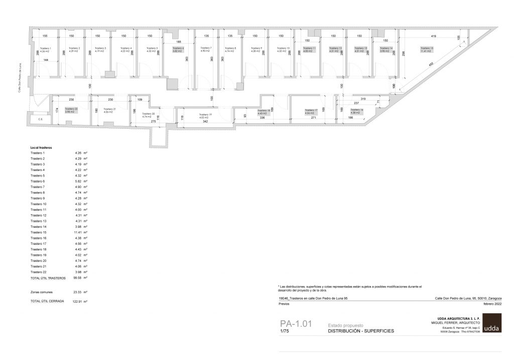 El proyecto consta de 22 trasteros, con superficies que van desde los 3,98 m2 a los 11,41 m2.