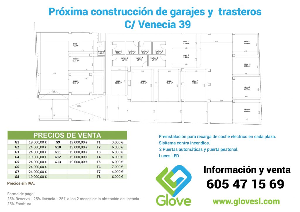 El proyecto consta de 13 plazas de aparcamiento y ocho trasteros. Las plazas de aparcamiento van desde los 5,50m x 2,50m hasta de 4,20m x 3,00m. Los trasteros van desde los 2,45m2 a 4,69m2.